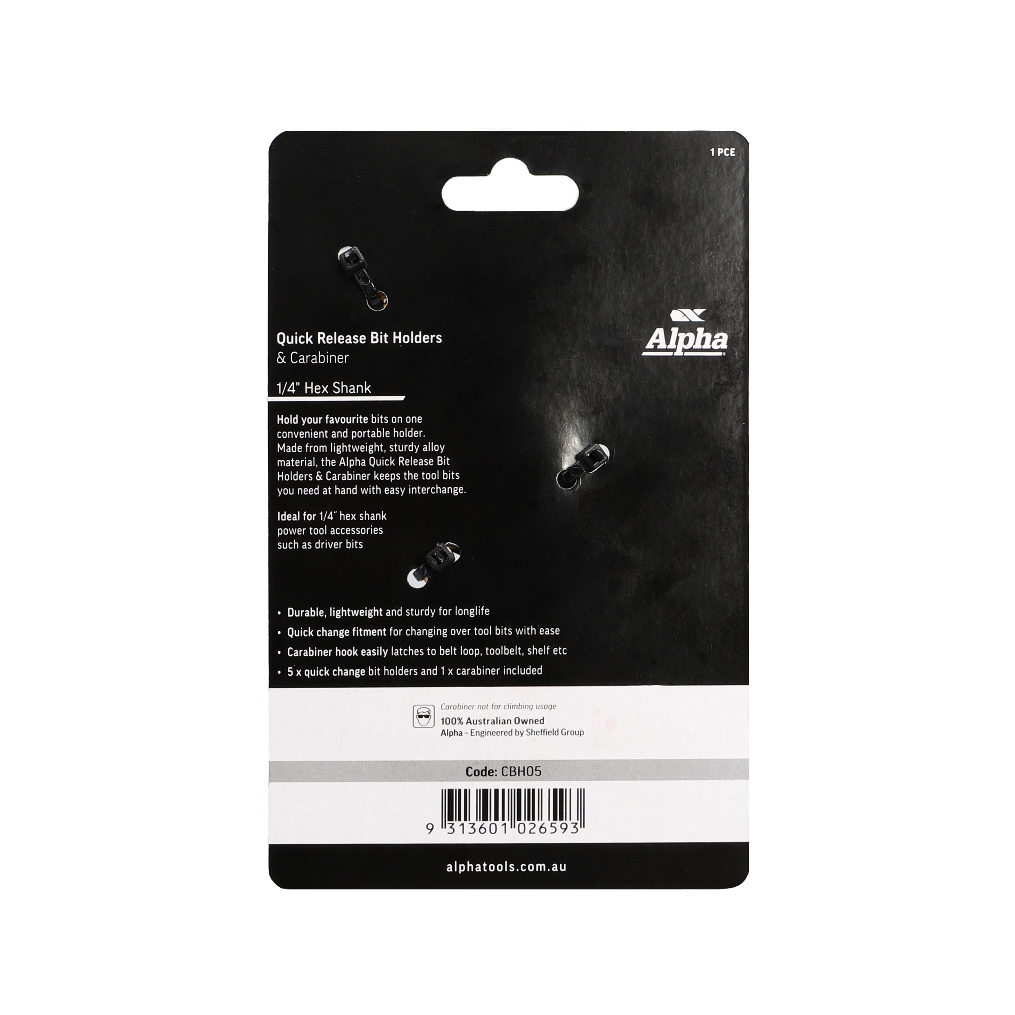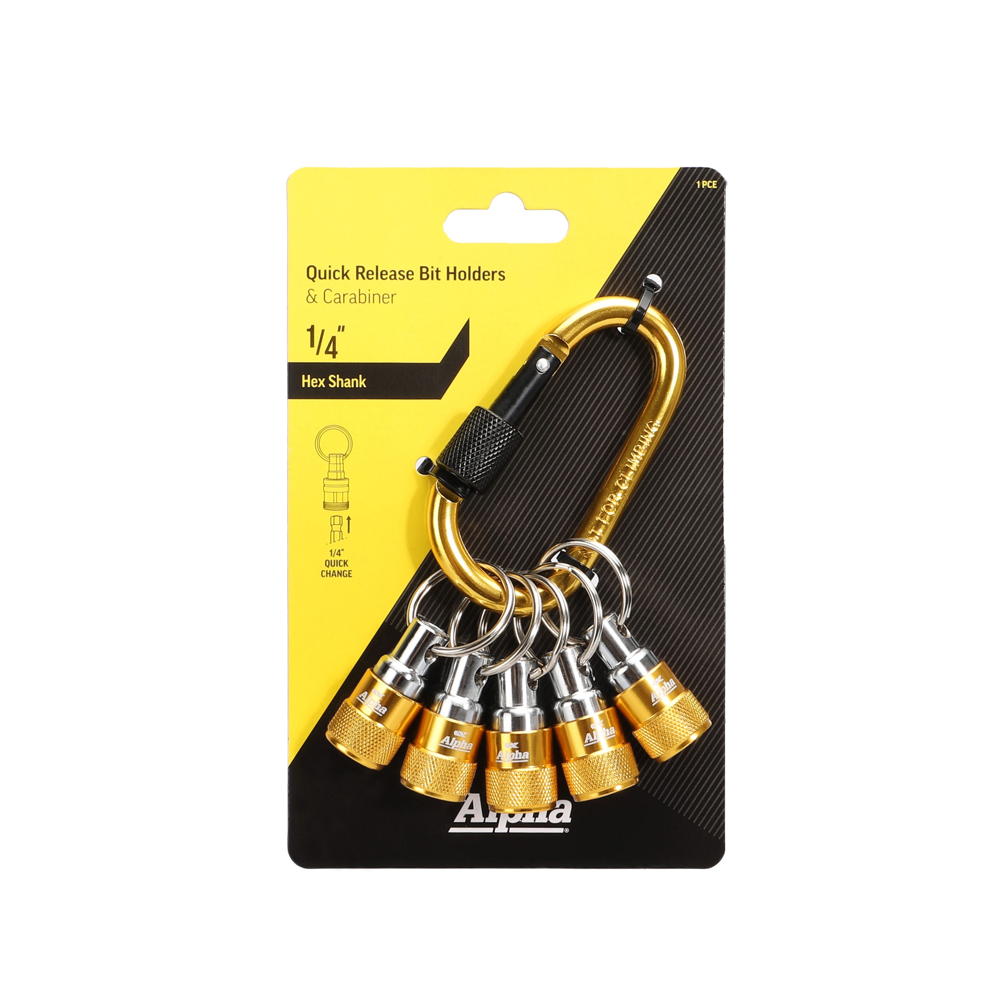 Made from lightweight, sturdy alloy material, the Alpha Quick Release Bit Holders & Carabiner keeps the tool bits you need at hand with easy interchange.