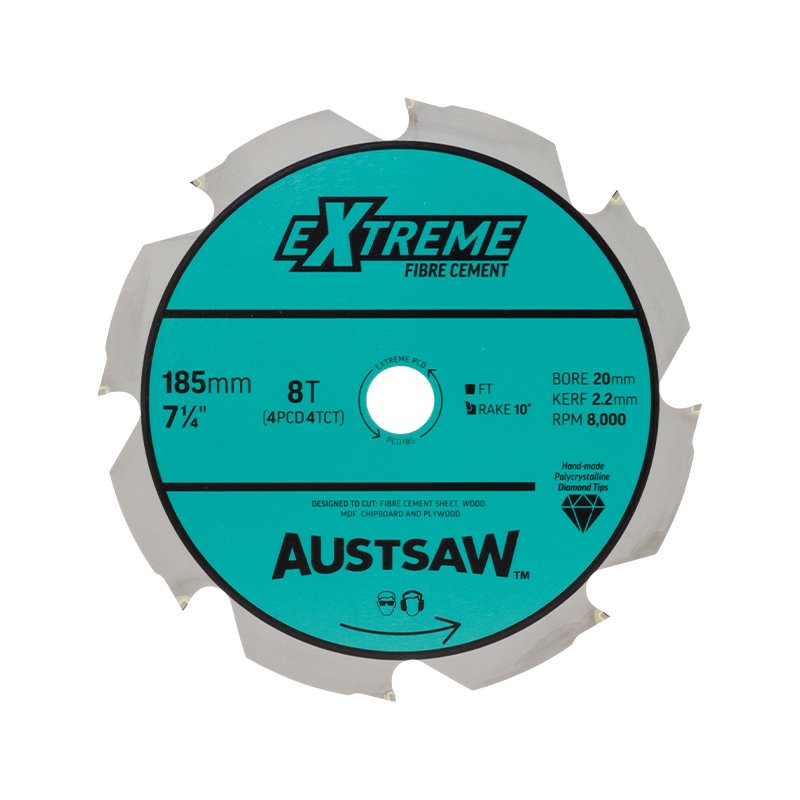 Specifically designed for fiber cement ripping and crosscutting. The polycrystalline diamond tips can run up to 50-100 times longer than carbide blades. The Austsaw PCD gives you a faster and cleaner cut! The tips are made of superior man-made polycrystalline diamond and the body of the blade is hardened tempered steel. You will experience extreme cutting performance.