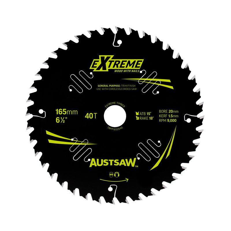 Austsaw Extreme: Wood with Nails Blade 165mm x 20/16 Bore x 40 T Thin Kerf