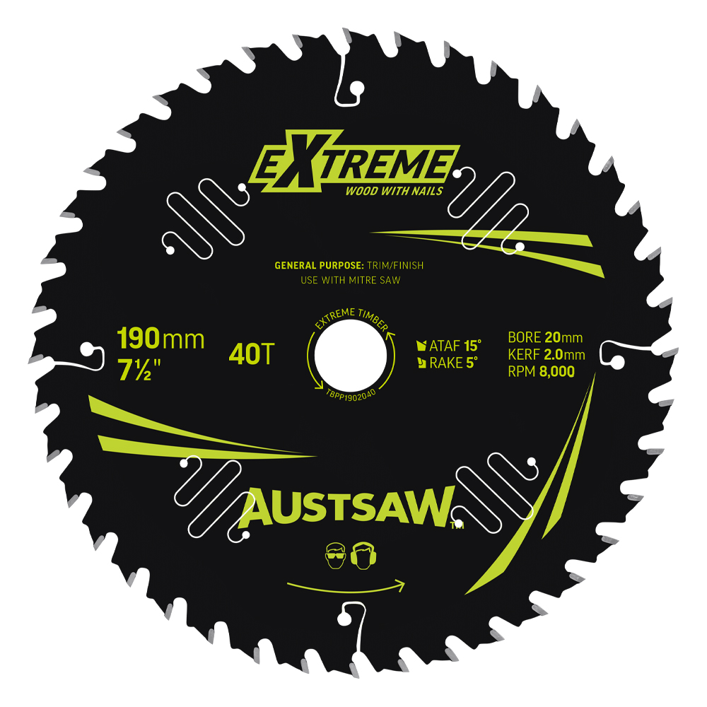 Austsaw Extreme: Wood with Nails Blade 190mm x 20 Bore x 40 T Thin Kerf